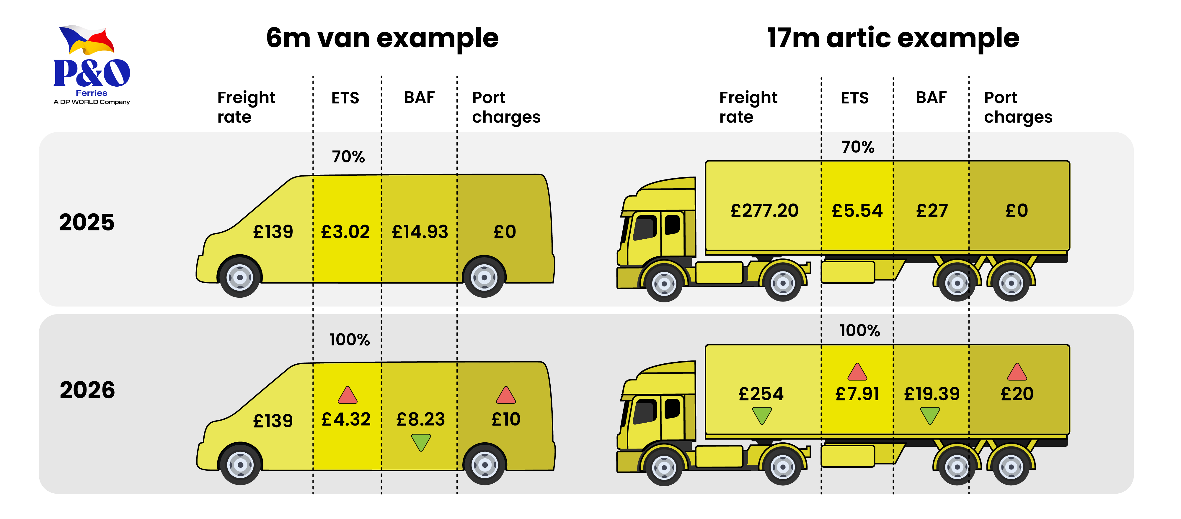 Since 1st January 2026, DFDS, Irish Ferries and P&O Ferries have introduced a new Dover Strait port charge (Dover - Calais and Dover - Dunkerque). This is in addition to ETS (100%) & BAF charges, and inflation increases.